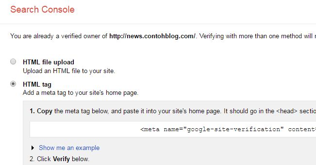 9. Klik Add dan akan muncul halaman seperti ini untuk memverifikasi kepemilkan blog.